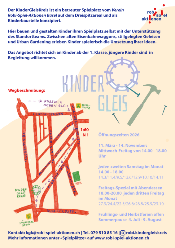Der KinderGleisKreis ist ein betreuter «Pop-Up-Spielplatz» auf dem Dreispitzareal. Auf dieser Kinderbaustelle verwiklichen Kinder, mit der Unterstützung des Leitungs-Teams, ihren Spielplatz zum Thema Eisenbahn und eigenen Ideen selbst. Der Platz befindet sich auf nicht mehr befahrenen Gleisen. In alten Güterwagons haben wir eine Werkstatt und Wohnzimmer eingerichtet. Eine weiterer gedeckter Wagon dient als Werkplatz. Draisnenkonstruktionen laden ein, um sich auf den Schienen zu bewegen. Die Jüngeren können sich auf dem Kindergleis in kleinen "Wagons" gegenseitig ziehen.